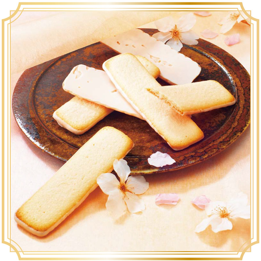 ほんのり桜色のクッキーの片面に、桜が香るストロベリー風味のチョコレートをコーティングしました。ココナッツを入れたさくさく食感のクッキーの香ばしさに、やさしく香る桜とストロベリーのほのかな風味が調和します。